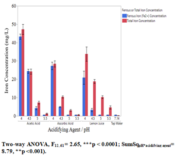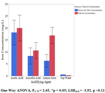Pooled data (Figure 3) across all pH levels focus on differences between the three acidifying agents. Results show that while all acids enhance iron release compared to tap water, there were no statistically significant differences between acetic acid, ascorbic acid, and lemon juice. This reinforces the conclusion that the degree of acidification is more important than the specific acidifying agent in maximizing iron release (One-Way ANOVA, F3, 70 = 2.65, *p = 0.05; LSDAcA = -3.92, p <0.11).