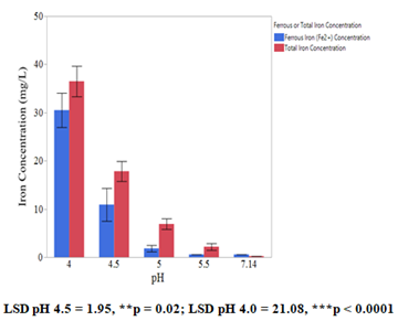 Data pooled across all three acidifying agents to isolate the effect of pH on iron release is shown in Figure 2. A clear trend of decreasing iron concentrations with increasing pH, confirms that lower pH levels, with the strongest effect at pH 4.0 and 4.5, optimize iron release (LSD pH 4.5 = 1.95, **p = 0.02; LSD pH 4.0 = 21.08, ***p < 0.0001). This trend again emphasizes that pH is the dominant factor influencing iron release, independent of the treatment used for acidification.