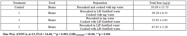 As reported in Table 2, black beans prepared with LIF-fortified water showed significantly higher total iron concentrations compared to the control (One-Way ANOVA, n=13, F3,8 = 14.40, p = 0.001; LSDTreatment3 = 18.86, p = 0.001). The greatest effect was observed when beans were both presoaked and cooked in LIF-fortified water (Treatment 3), which nearly tripled the iron concentration (67.95 + 5.26 µ/g) relative to the control (30.09 + 13.70 µ/g).