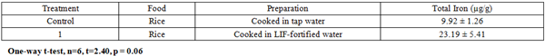Table 3. Total iron content of rice prepared with LIF-fortified water using acetic acid at pH 4.5. Total iron concentrations summarized as means and standard deviations from triplicate readings