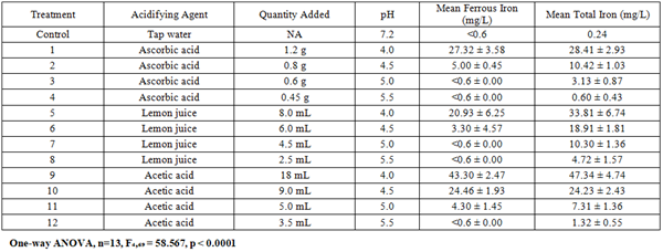 Table 1 summarizes ferrous and total iron released (mg/L) from LIF at varying pH values. These values demonstrate that for each organic acid tested, iron release increased significantly as pH decreased, with all treatments yielding higher concentrations than the tap water control (One-way ANOVA, n=13, F₄,₆₉ = 58.567, p < 0.0001). The greatest concentration of ferrous and total iron was observed with Treatment 9 (acetic acid, pH 4.0) resulting in ferrous and total iron concentrations of 43.30 mg/L and 47.34 mg/L, respectively.